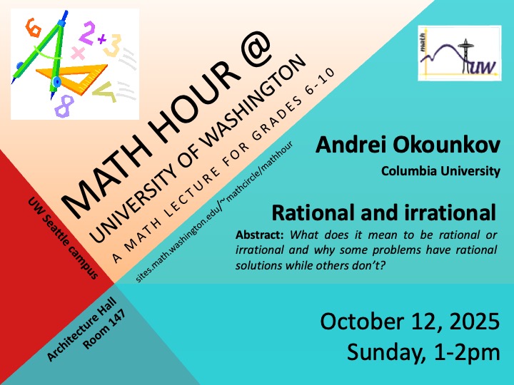Andrei Okounkov, Columbia University, 2025 Walker Ames scholar Sunday, October 12 2025, 1 - 2pm MGH 389 UW Math Hour What does it mean to be rational or irrational and why some problems have rational solutions while others don’t? Related Links UW Monthly Math Hour Event Type Special Events Event Subcalendar UW Math Hour